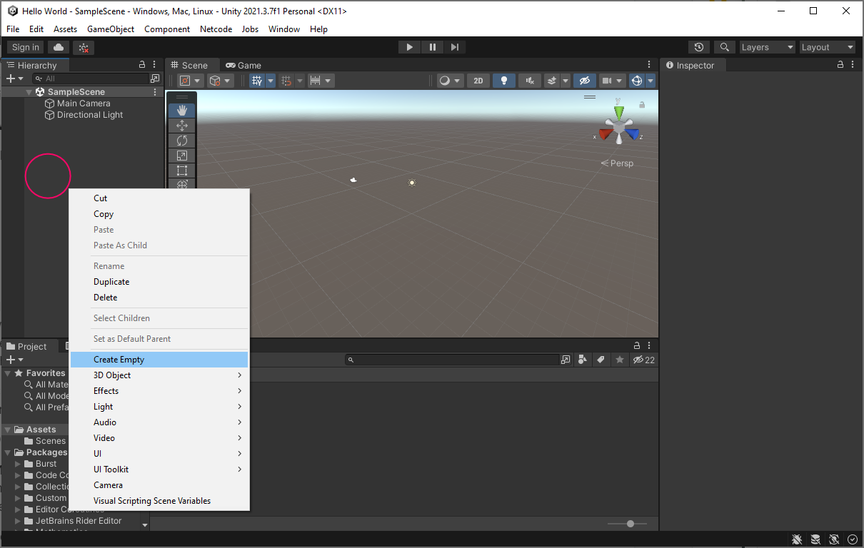- Right-click in the Hierarchy tab, then select Create Empty to create an empty GameObject.