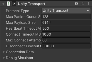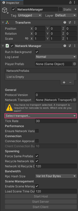 - In the Inspector tab, locate the Unity Transport section, then select UnityTransport as the Protocol type.
