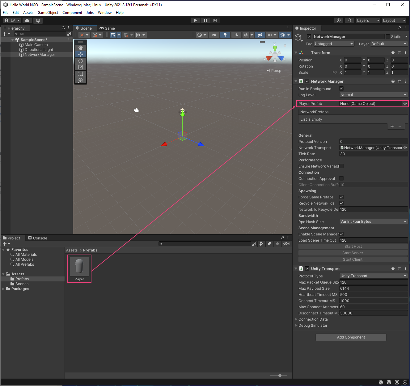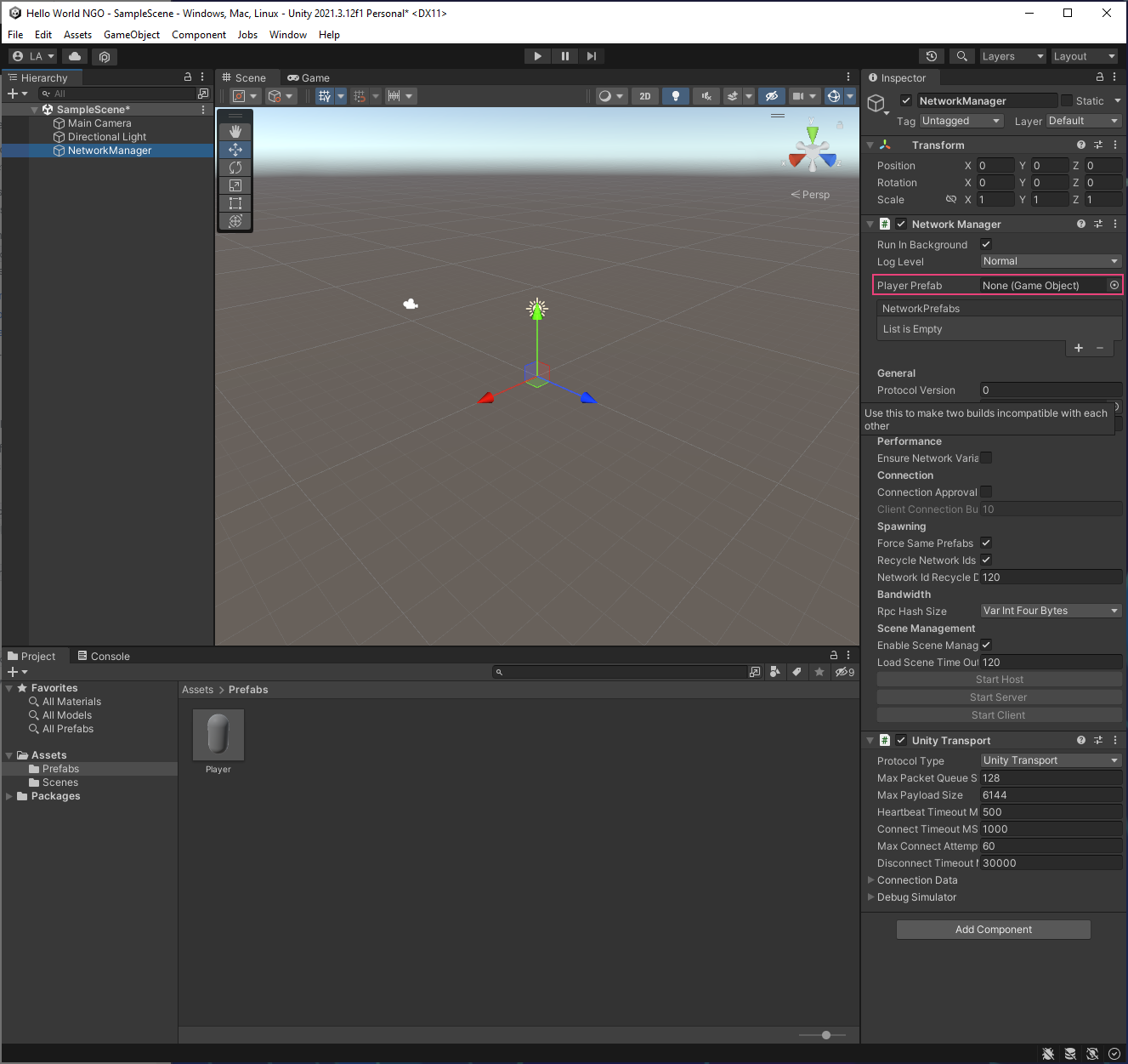 - Drag the Player prefab from the Project tab into the PlayerPrefab slot within the NetworkManager component in the Inspector tab.