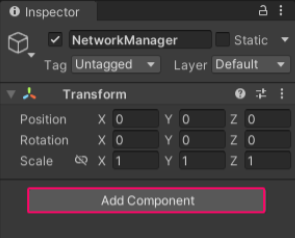 - Select NetworkManager, then select Add Component from the Inspector tab.