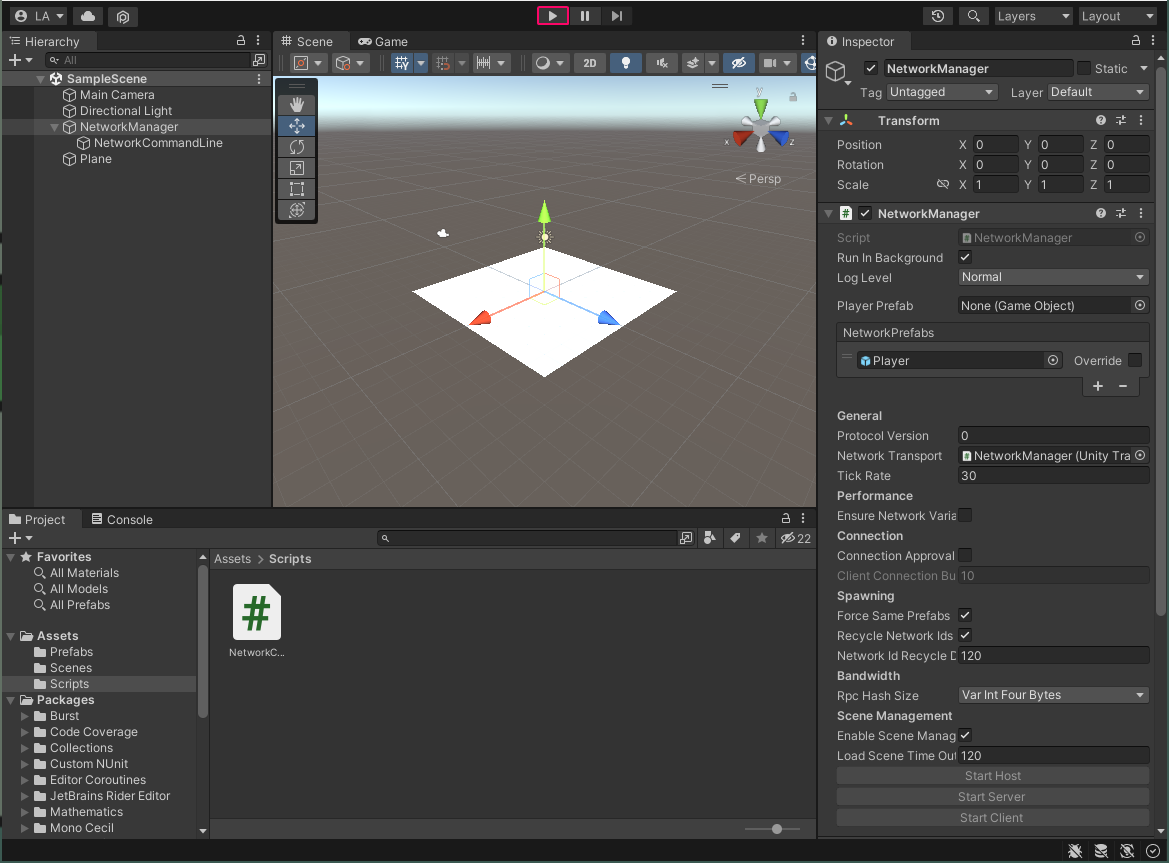 Now that you have a NetworkManager, assigned a PlayerPrefab, and added your current scene to the scenes in build test, you can quickly verify everything is functioning/configured correctly via entering play mode in the Unity Editor. By starting a host, you are starting NetworkManager as both a server and a client at the same time.