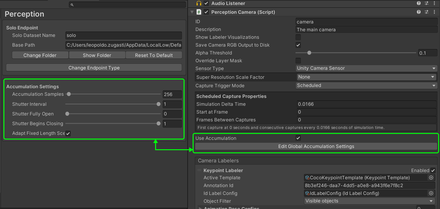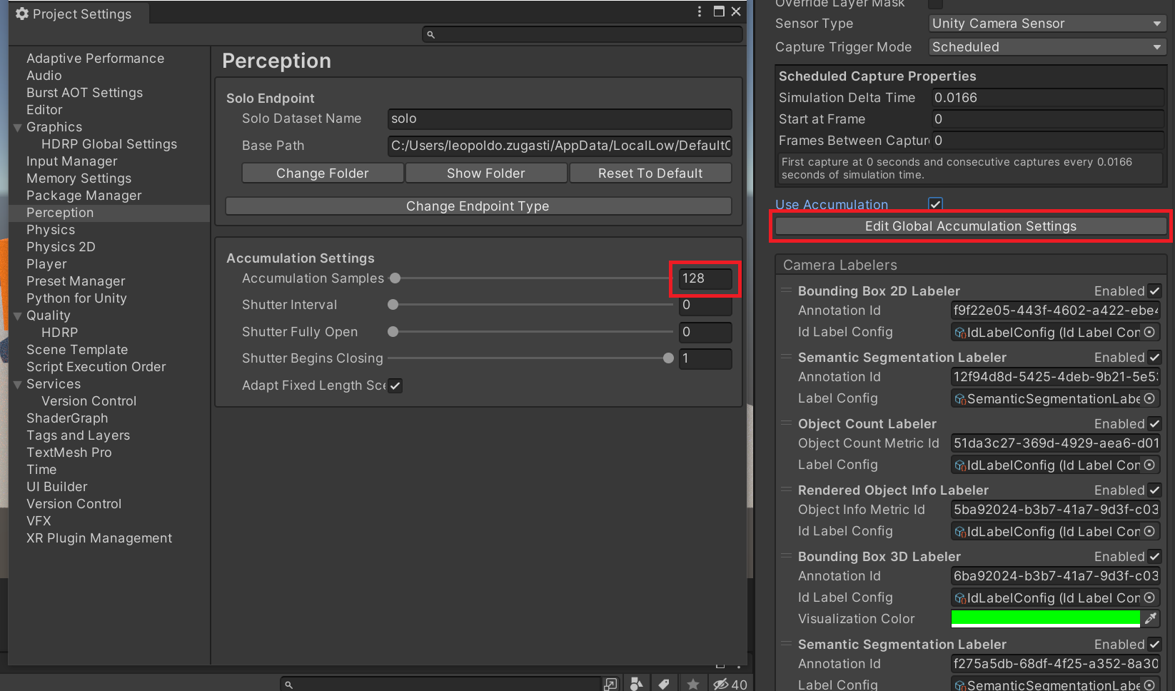 - Accumulation can be enabled on any PerceptionCamera by enabling the Use Accumulation option