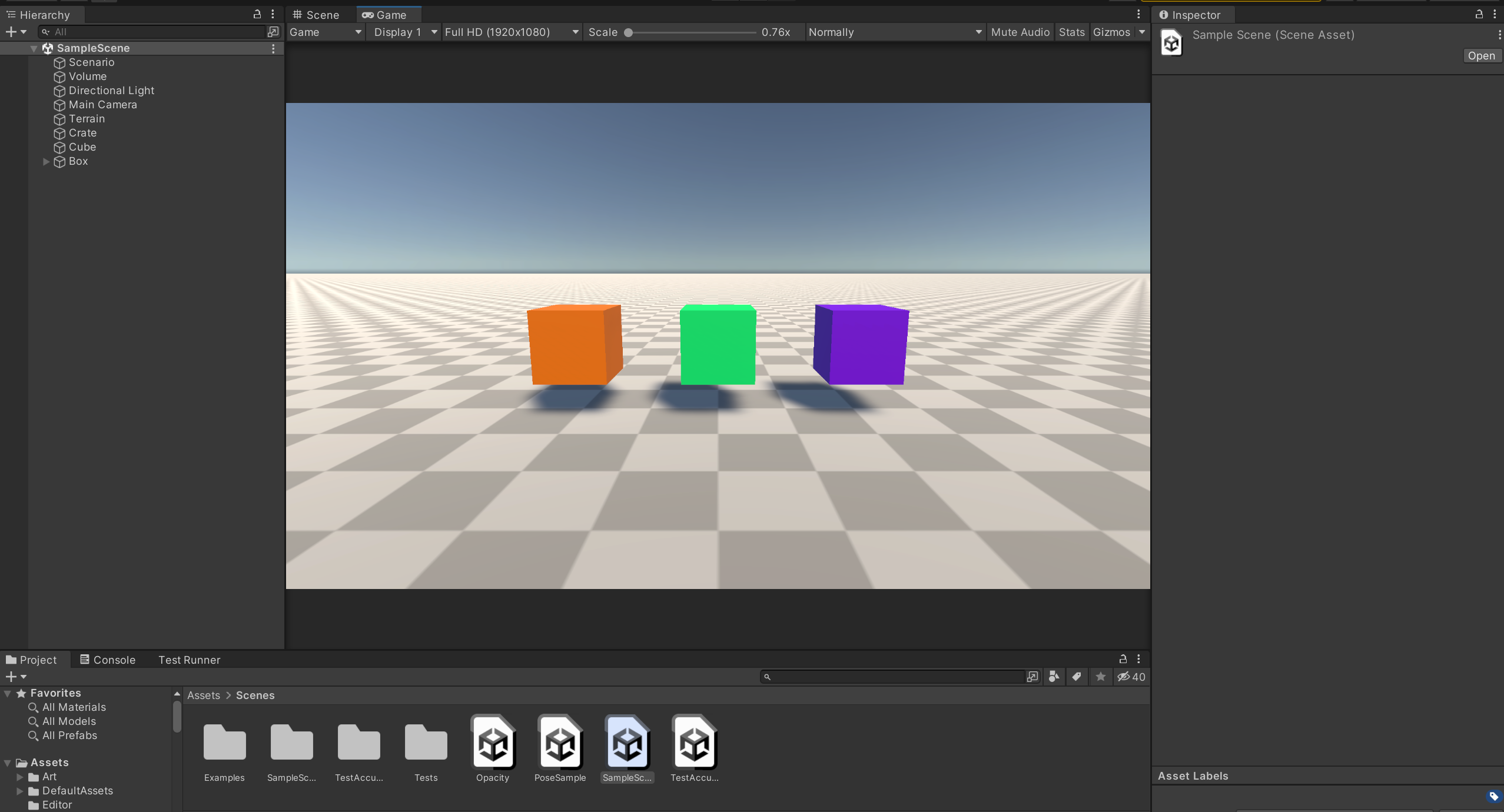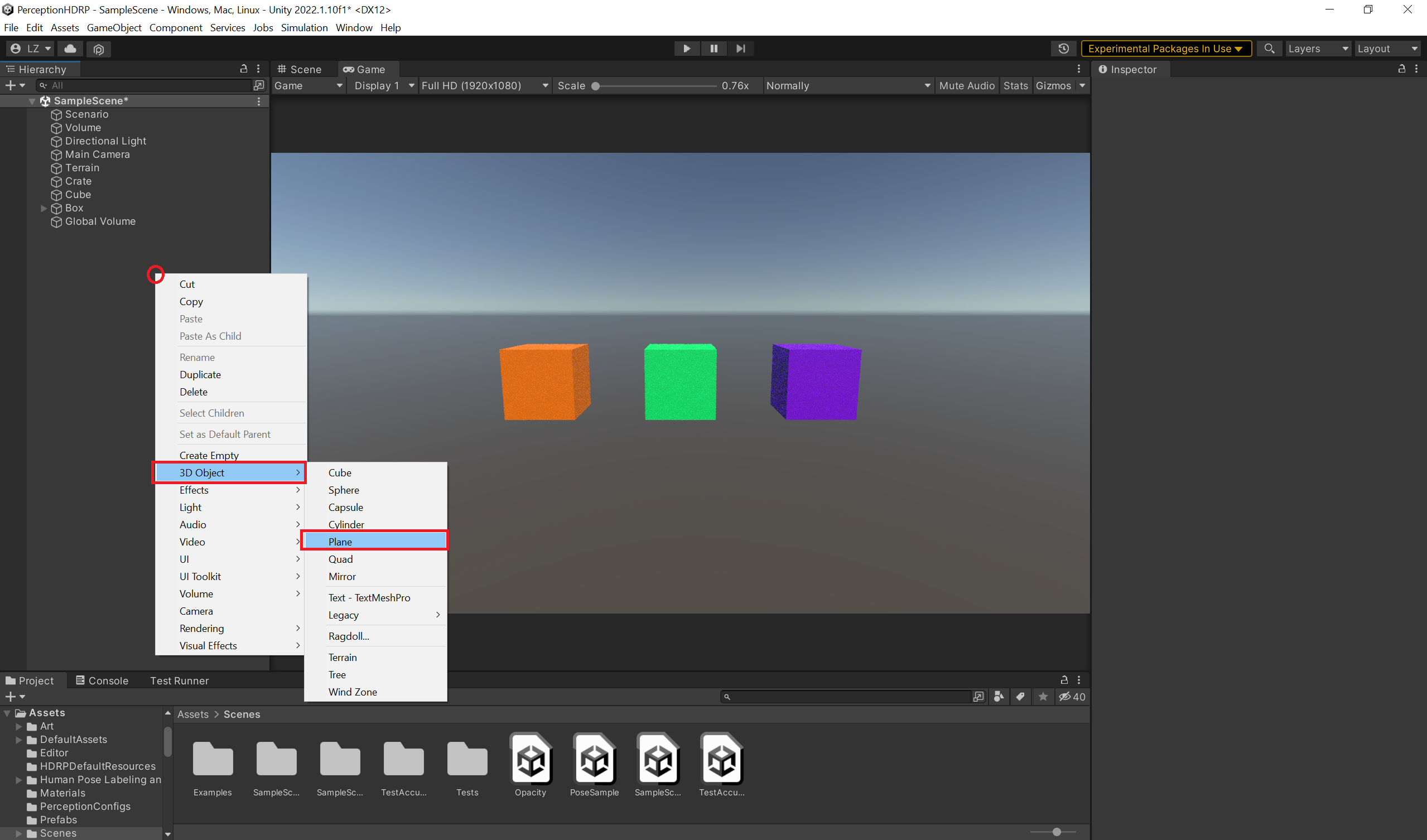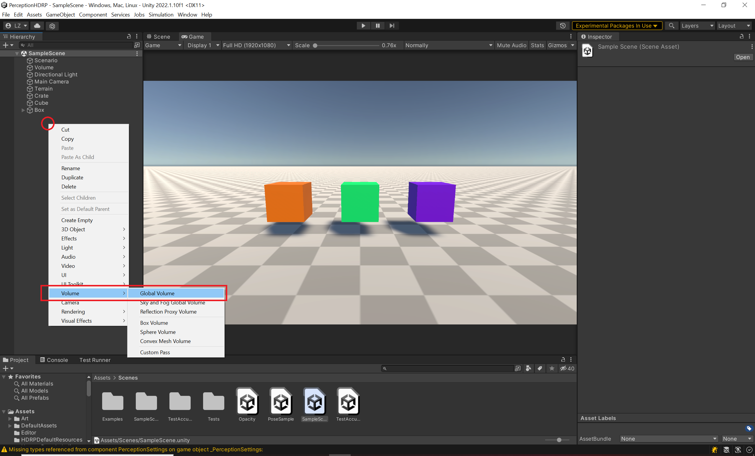 - For this example we'll use the SampleScene provided in the PerceptionHDRP project but you can follow along using any Scene