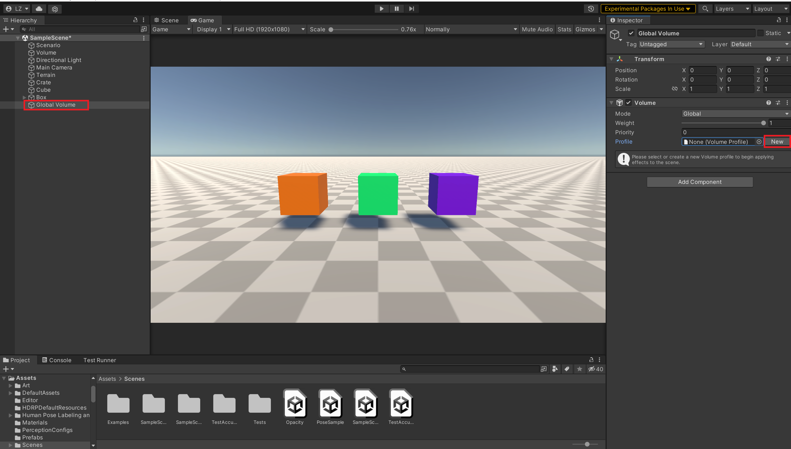 - Setup a Global Volume by right clicking on the scene hierarchy as follows: