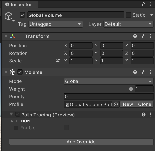 - Add path tracing to the Scene by clicking on Add Override > Ray Tracing > Path Tracing. You should now see the path tracing override added: