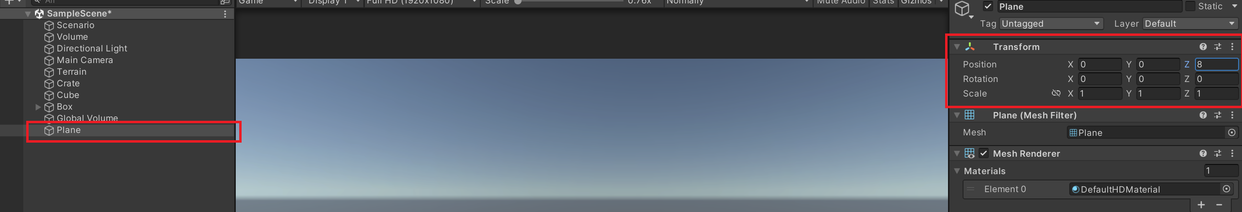 - In order to see shadows let's add a new Plane Game Object to replace the floor in the same way we added the global volume earlier and change it's z position to 8
