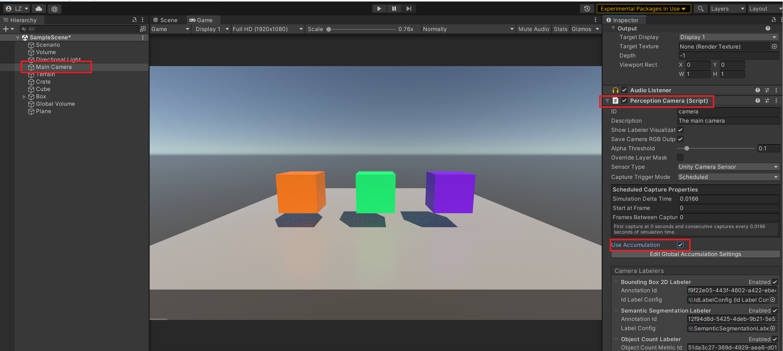 - To fix this we want to tell the PerceptionCamera to use Accumulation, to do so go to the Main Camera object and select Use Accumulation on the PerceptionCamera component