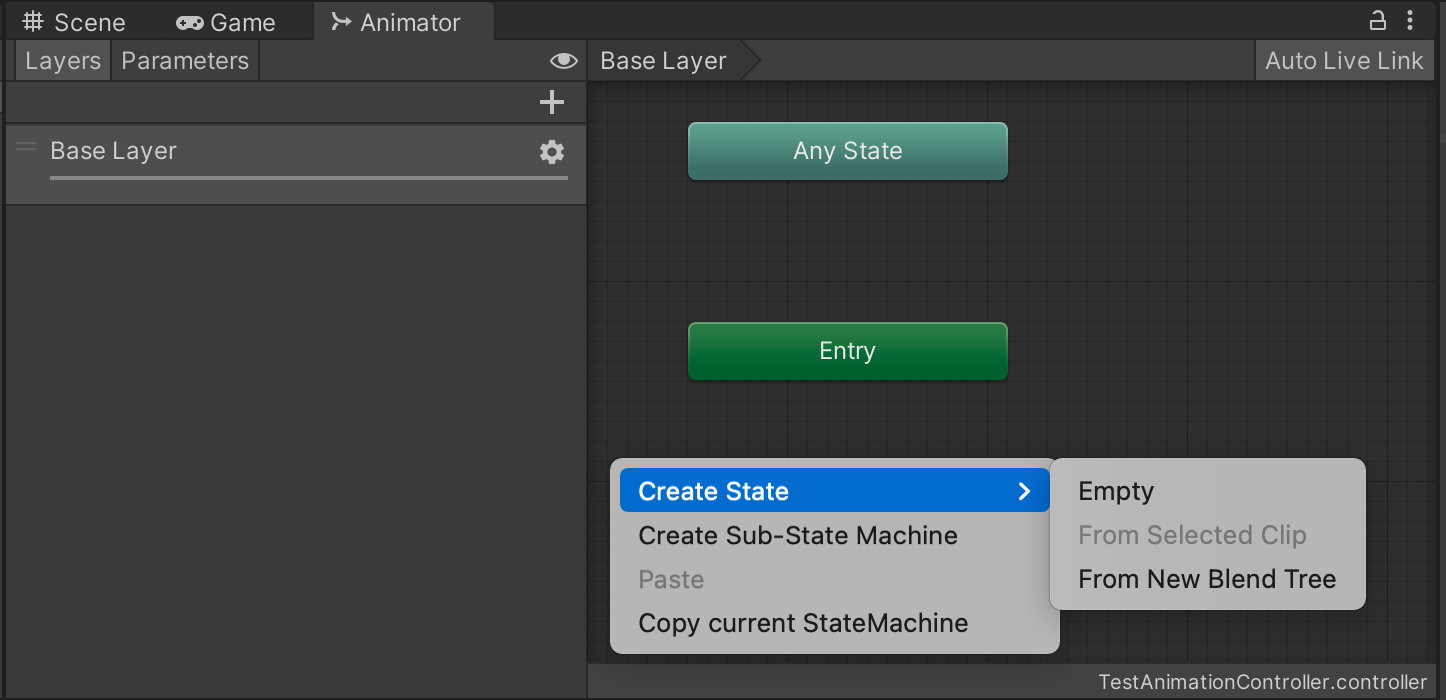 This will create a new state and attach it to the Entry state with a new transition edge. This means the controller will always move to this new state as soon as the Animator