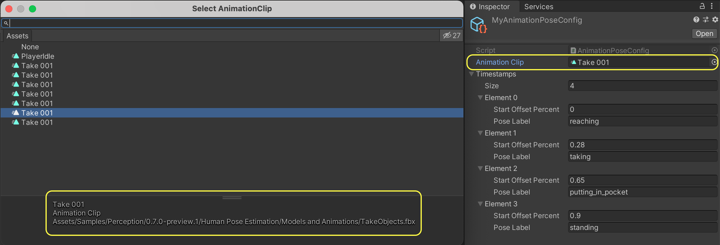 ℹ️ To find the time indexes in an animation clip that correspond with different poses, you can directly open the clip inside the Inspector. Click on the
