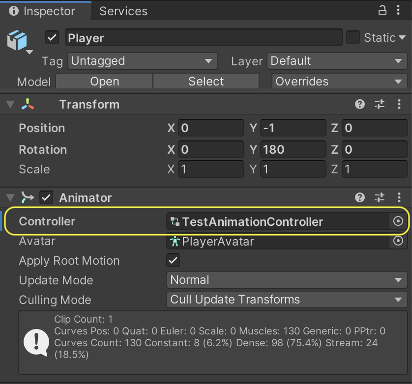 asset. In the Inspector view, choose the same animation clip as before for theAnimation Clip