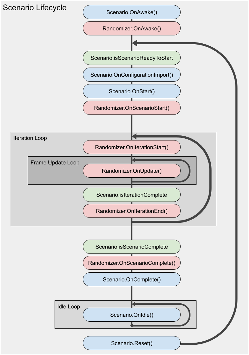 For use cases where the Scenario should run for an arbitrary number of frames, implementing a custom Scenario may be necessary. Below are the two most common Scenario properties a user might want to override to implement custom Scenario Iteration conditions: