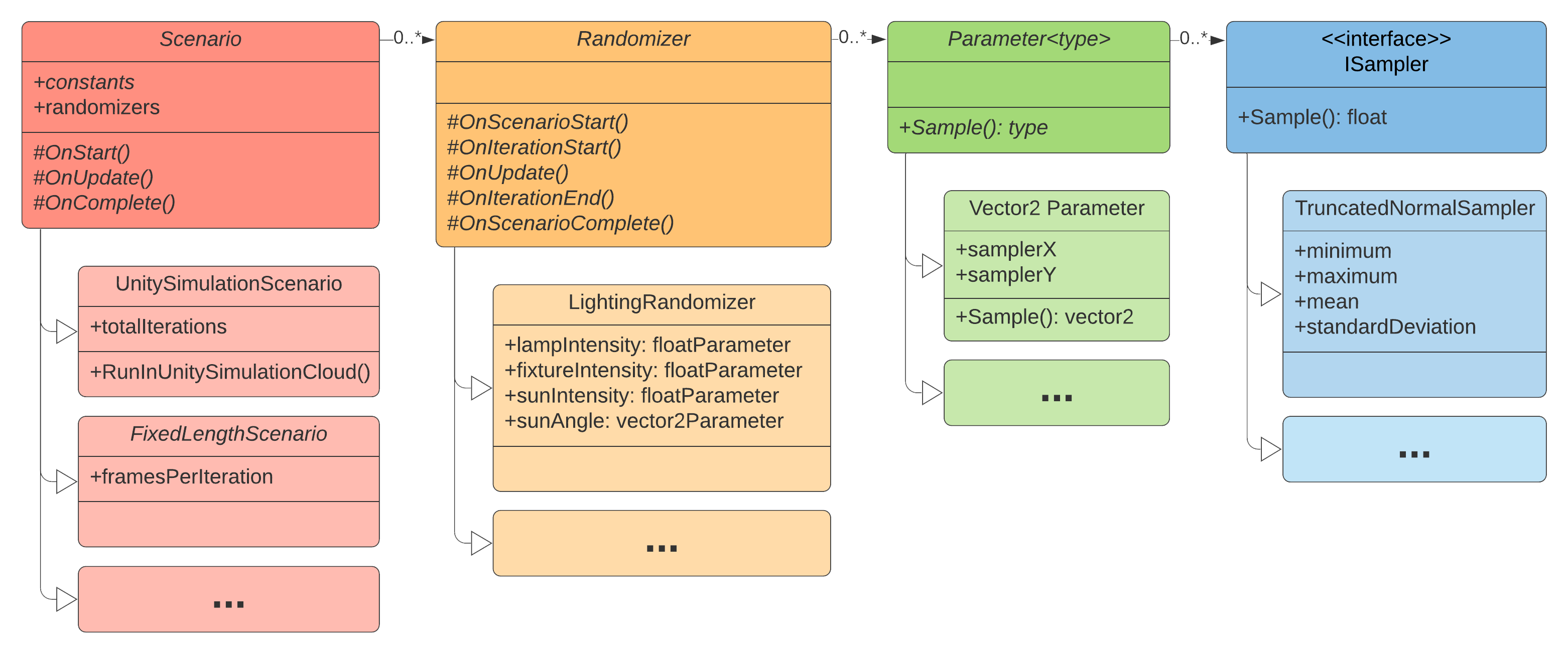 Randomizers encapsulate specific randomization activities to perform during the lifecycle of a randomized simulation. For example, Randomizers exist for spawning objects, repositioning lights, varying the color of objects, etc. Randomizers expose random Parameters to their inspector interface to further customize these variations.