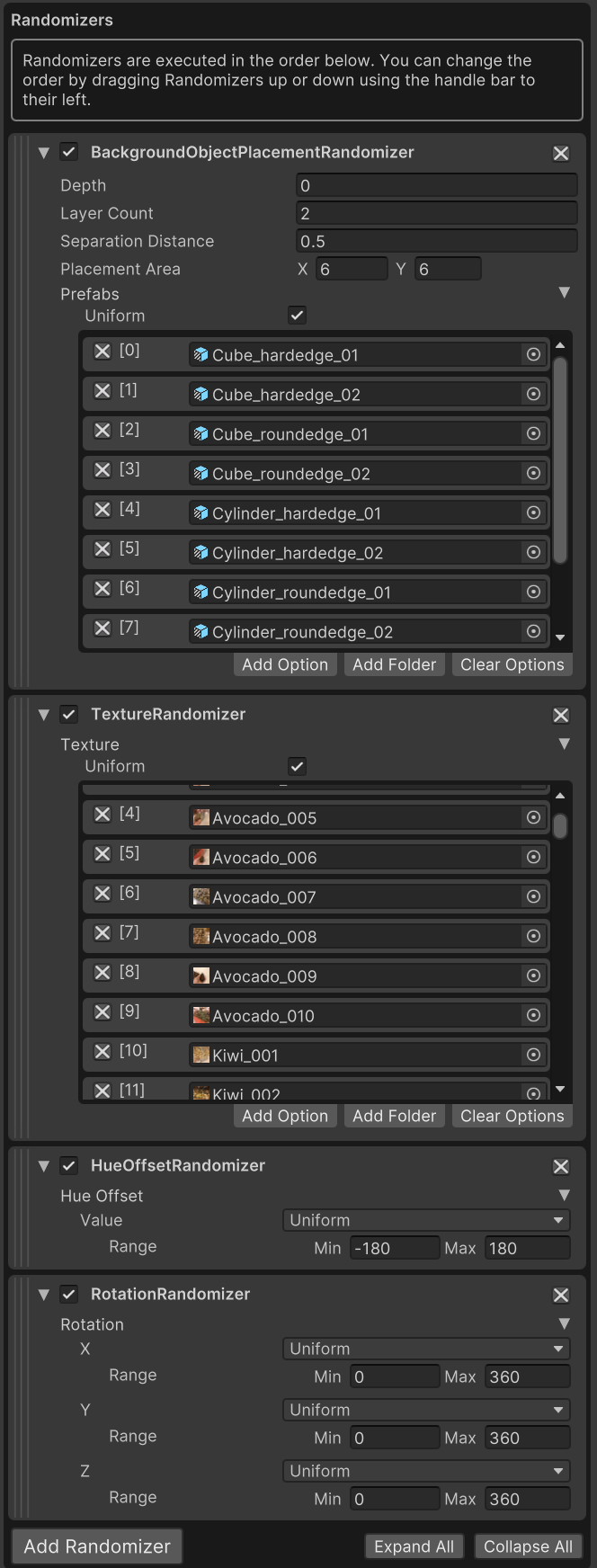 will have the task of attaching random textures to our colorless background objects at each Iteration of the Scenario. Similarly, HueOffsetRandomizer