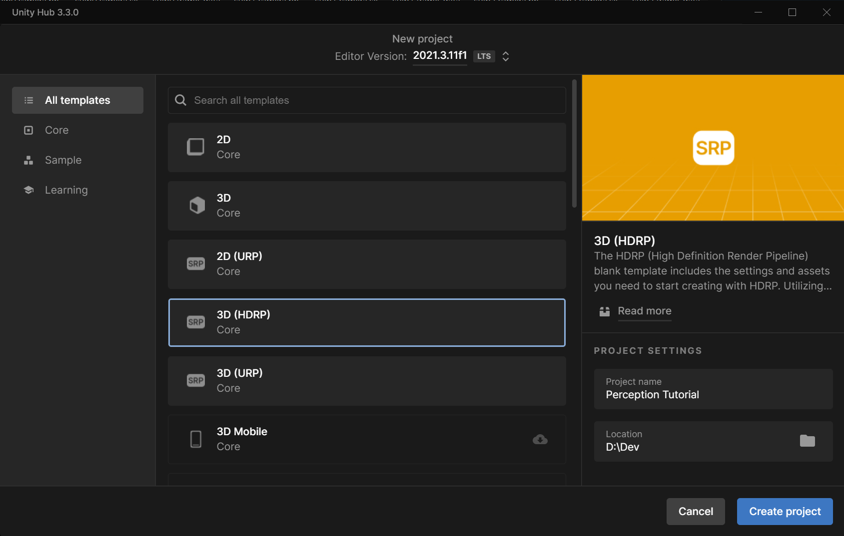 - 🟢 Action: Open Unity and create a new 3D (HDRP) project (You may need to download the HDRP template). Name your new project Perception Tutorial, and specify the desired location as shown below.