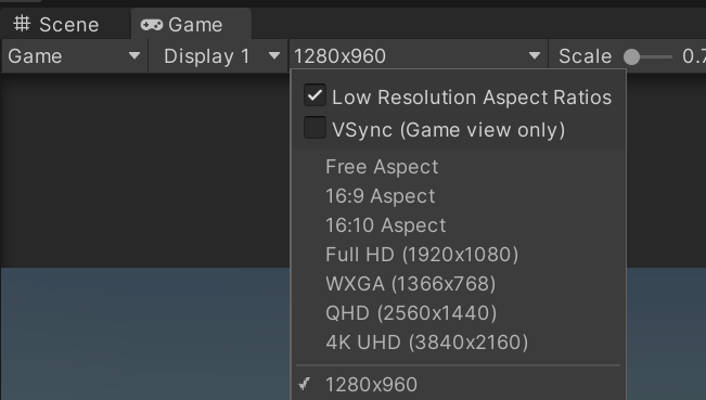 ℹ️ Your Game tab may have a different field of view than the one shown here. We are using a 1280 x 960 resolution, which has a 4:3 aspect ratio. You can change the resolution or aspect ratio of your Game view from the menu located at the top of the tab:
