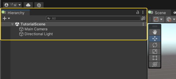 The Hierarchy tab of the editor displays all the Scenes currently loaded, and all the objects currently present in each loaded Scene, as shown below: