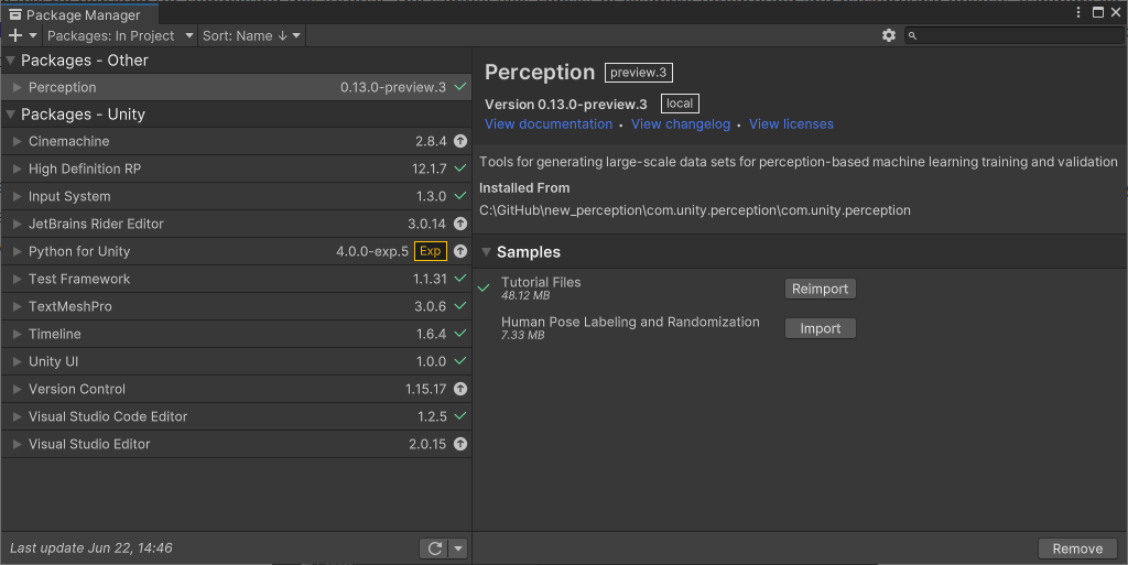 You will then see the newly downloaded Perception package automatically selected in the Package Manager, as depicted below: