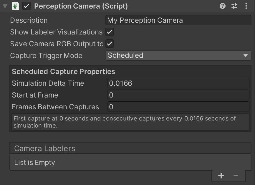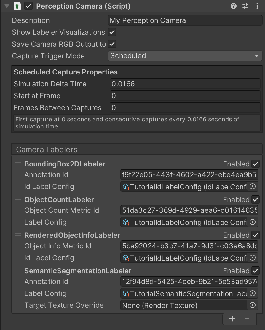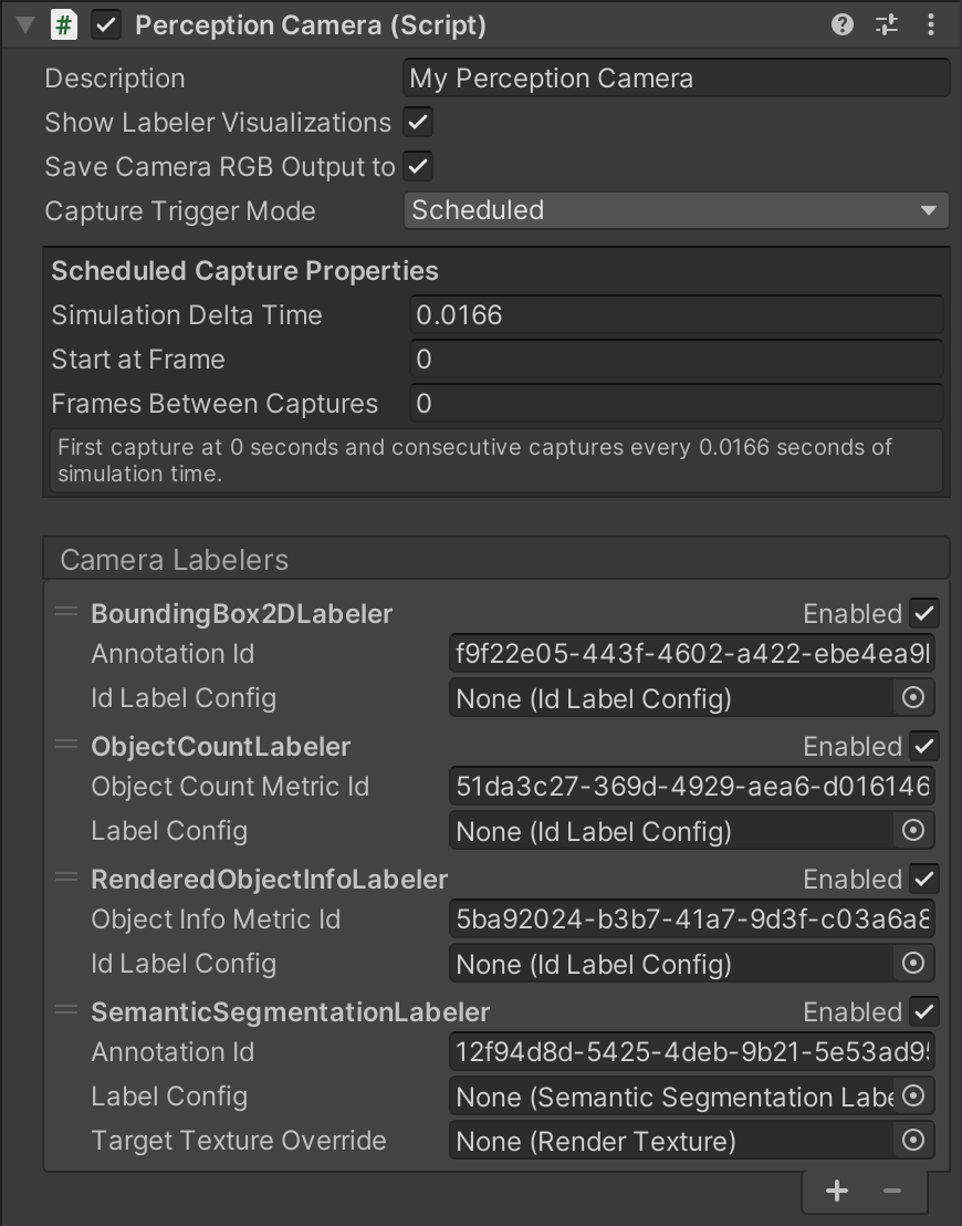 Once you add the Labelers, the Inspector view of the Perception Camera