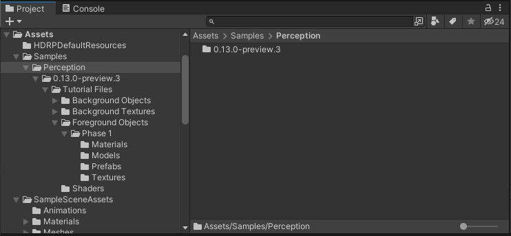 Once the sample files are imported, they will be placed inside the Assets/Samples/Perception/<Perception Package Version>/Tutorial Files