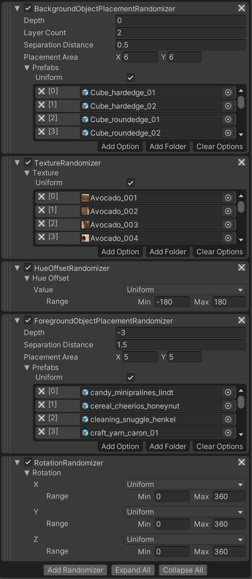 While the texture and color of the foreground objects will be constant during the simulation, we would like their rotation to be randomized similar to the background Prefabs. To achieve this: