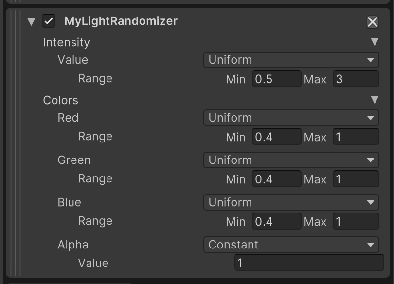 is always between 0 and 1. Therefore, we now need to change the range for the corresponding Parameter in MyLightRandomizer