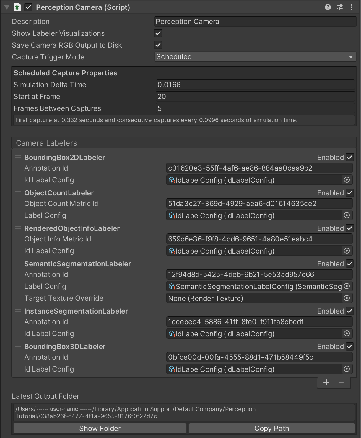 | Capture Trigger Mode | The method of triggering captures for this camera. In Scheduledmode, captures happen automatically based on a start frame and frame delta time. InManualmode, captures should be triggered manually through calling theRequestCapturemethod ofPerceptionCamera. |