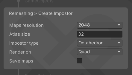 | Maps resolution | The resolution of texture maps that are baked to render the impostor. Example: 4096 x 4096. |
