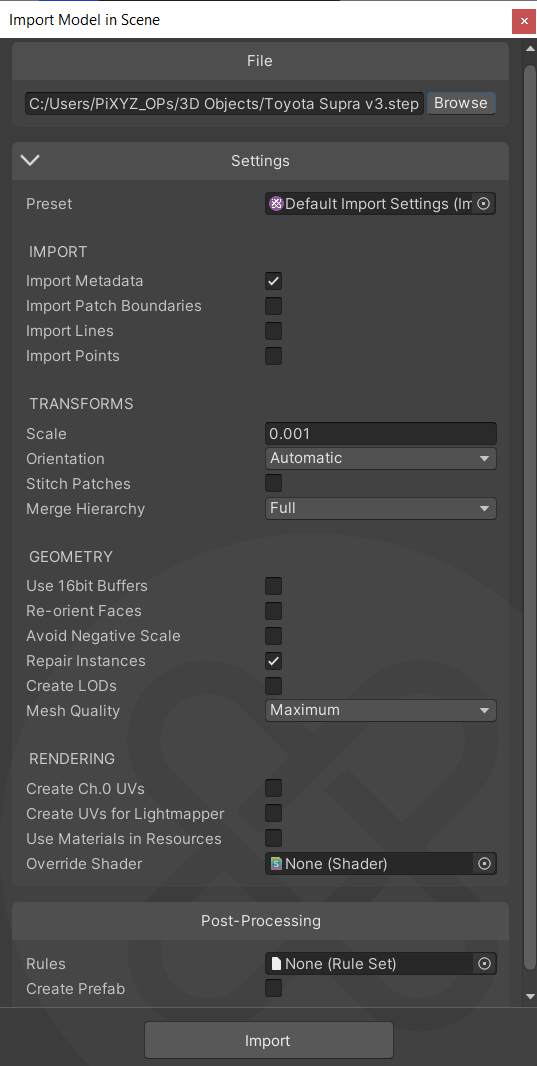 From the Pixyz menu, choose Import Model.