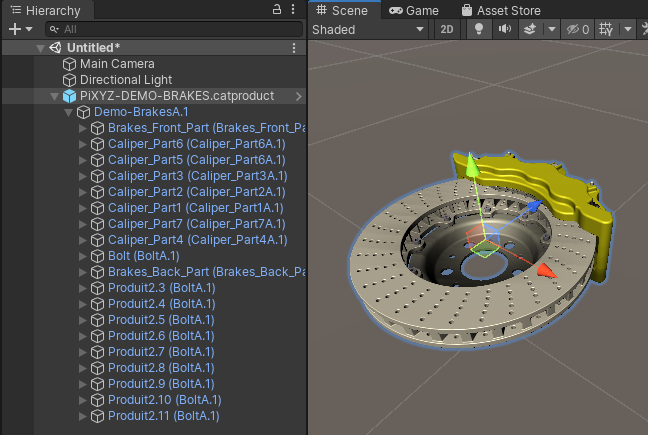 Pixyz imports the model and processes it according to the input parameters. After import, the hierarchy and the scene view show the imported asset. The import process preserves the product structure of the model from the source CAD file. Each part within the hierarchy is a GameObject.