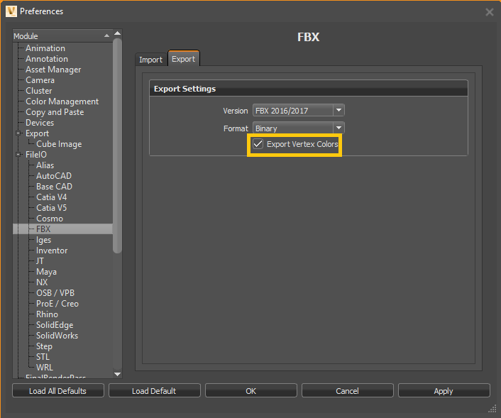 To import ambient occlusion as vertex colors, open Autodesk VRED, select Preferences > FileIO > FBX > Export, and set ExportVertexColors to True: