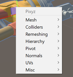 Pixyz doesn't refresh the menu automatically. To refresh this menu, from the Pixyz menu, select Toolbox > Refresh Toolbox. Pixyz updates this file: Assets/Plugins/Pixyz/Editor/ToolboxMenuItems.cs. If required, you can edit the file manually.