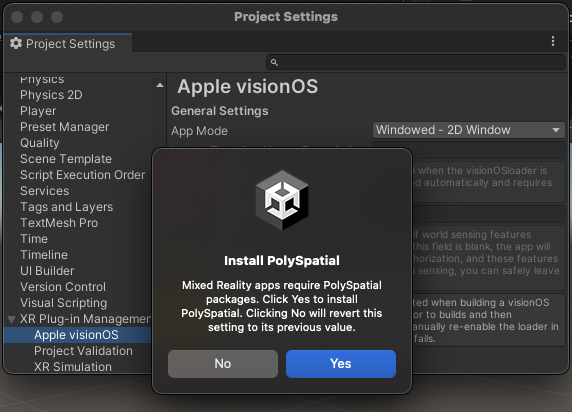 After you install the Apple visionOS XR Plugin, you can choose whether your app launches in Metal or windowed mode with the App Mode setting. You can access this setting in Apple visionOS section under XR Plug-in Management in your Project Settings. If you choose one of the remaining options, RealityKit with PolySpatial or Hybrid - Switch between Metal and RealityKit, Unity offers to install the PolySpatial packages for you.