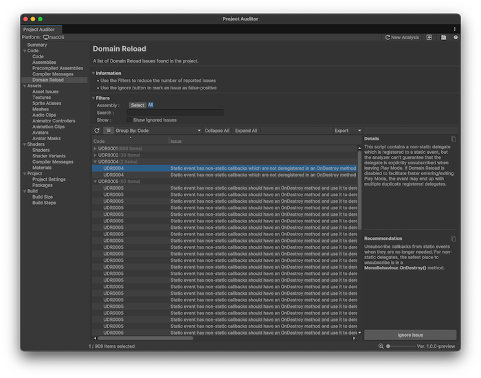 Project Auditor window with the Domain Reload view open