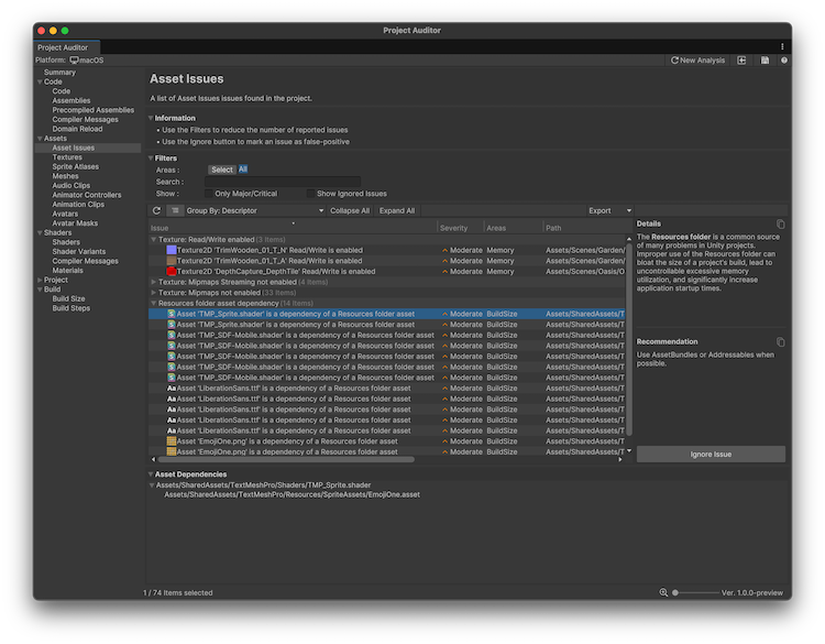 | Path | The full path and file name of the asset in which the issue was found. Double-click on any issue to select the corresponding asset in the Project window to view it in the Inspector. |
