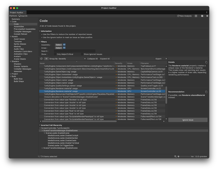 Project Auditor window with the Code view open