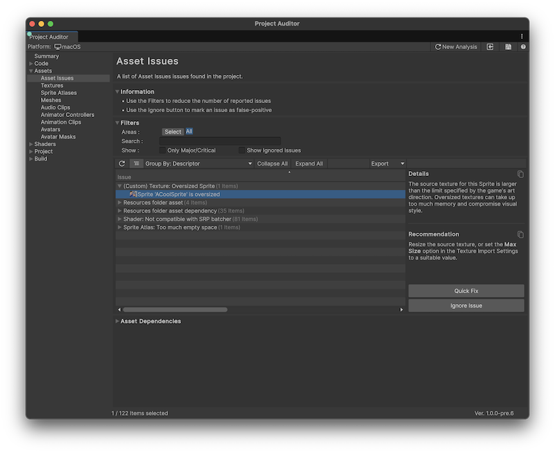 The following is an example showing how to create a custom Analyzer. Imagine a texture-heavy 2D game with a pixel art visual style. In such a project it might be desirable to enforce maximum sizes for sprite texture assets to help manage memory and to enforce a consistent visual resolution.