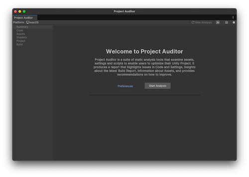 To open the Project Auditor window, go to Window > Analysis > Project Auditor. When you open the window for the first time, it opens on the Welcome screen.