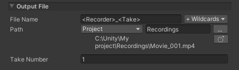 | Output Location button (...) | Opens a Unity file browser where you can choose a custom output path. When you choose a path this way, the Recorder automatically sets the drop-down menu to Absolute. | |