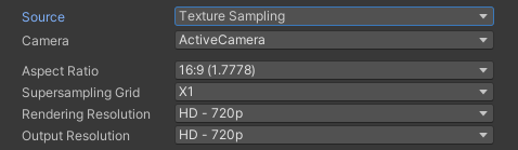 | Render Texture Asset | Records frames rendered in a Render Texture. Selecting this option displays the Render Texture Asset source properties. |