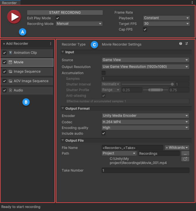 The Recorder window allows you to set up a list of Recorders to capture and export various types of data from your current Scene, in Play mode. This window includes recording controls that allow you to start and stop your recordings according to a specified frame or time interval, or manually.