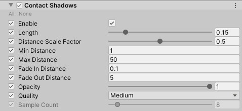 | Fade In Distance | The distance, in meters, over which HDRP fades Contact Shadows in when past the Min Distance. |