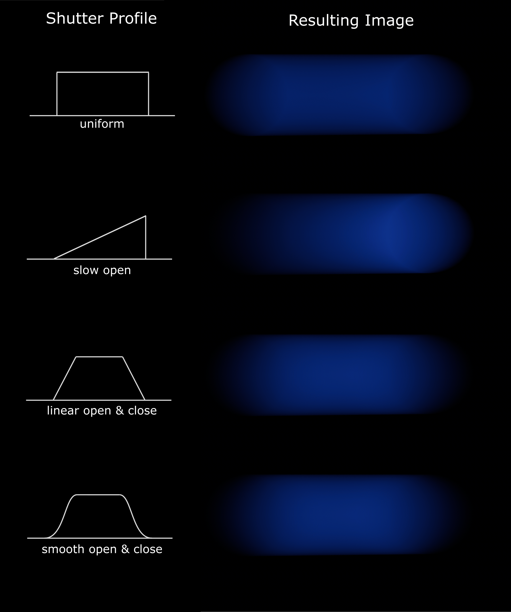 The BeginRecording call allows you to specify how fast the camera shutter opens and closes. The speed of the camera shutter defines the so called “shutter profile”. The following image demonstrates how different shutter profiles affect the appearance of motion blur on a blue sphere moving from left to right.