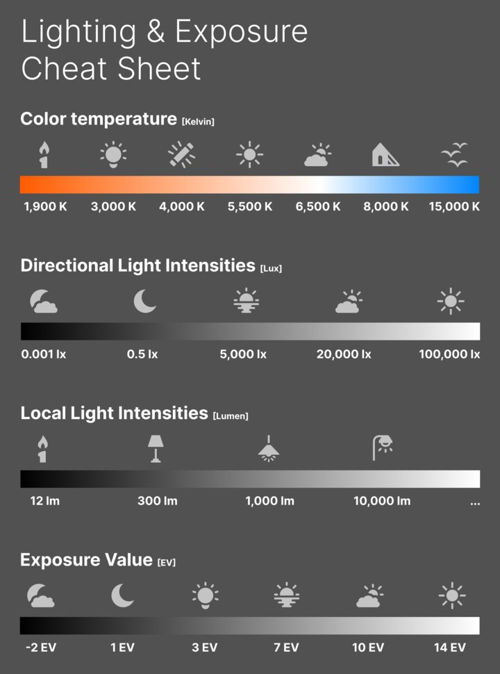 The following diagram shows scales of light and exposure values in different units. The icons along each scale represent light sources that match the marked value.