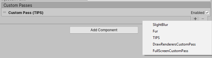 The main part of the Custom Pass Volume component is the Custom Passes reorderable list, it allow you to add new custom pass effects and configure then. There are two custom passes that are builtin to HDRP, the FullScreen and the DrawRenderers custom pass.