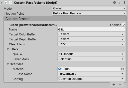 NOTE: You can stack multiple custom pass volumes but only one per injection point can be executed, the one that will be executed is the smallest currently overlapping collider extent (without the fade radius). It means that global volumes are lower priority than local ones.