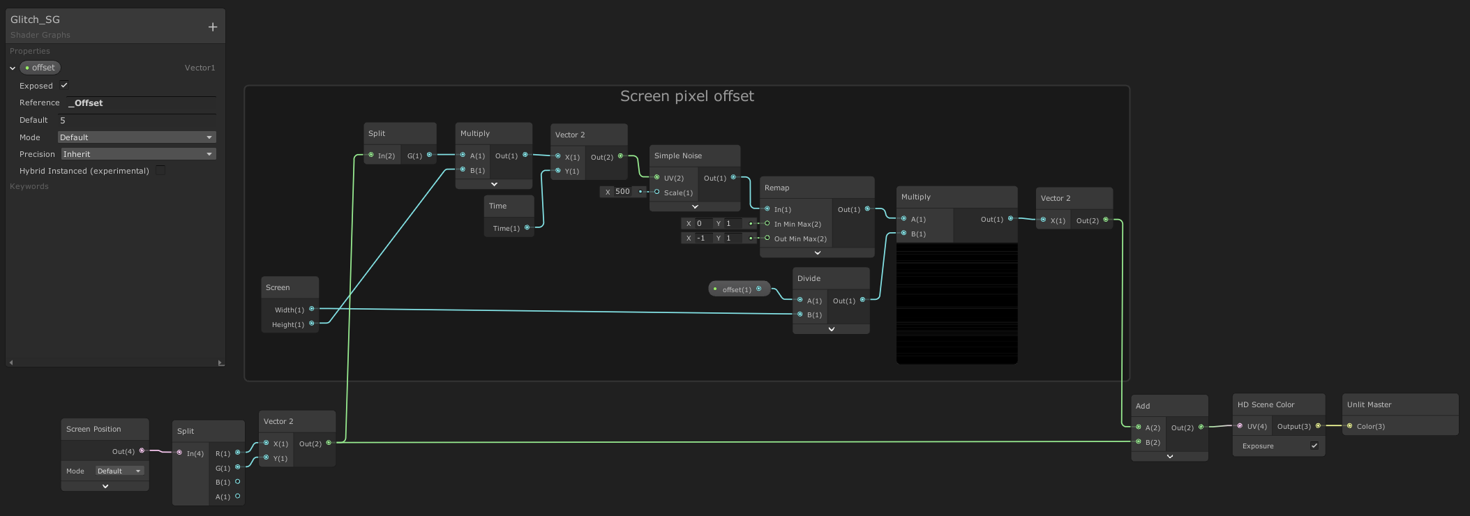 First, we create an Unlit HDRP ShaderGraph and add some nodes to sample the scene color with a random x offset, to create the distortion like effect. We also have an external parameter to control the strength of the effect called offset.