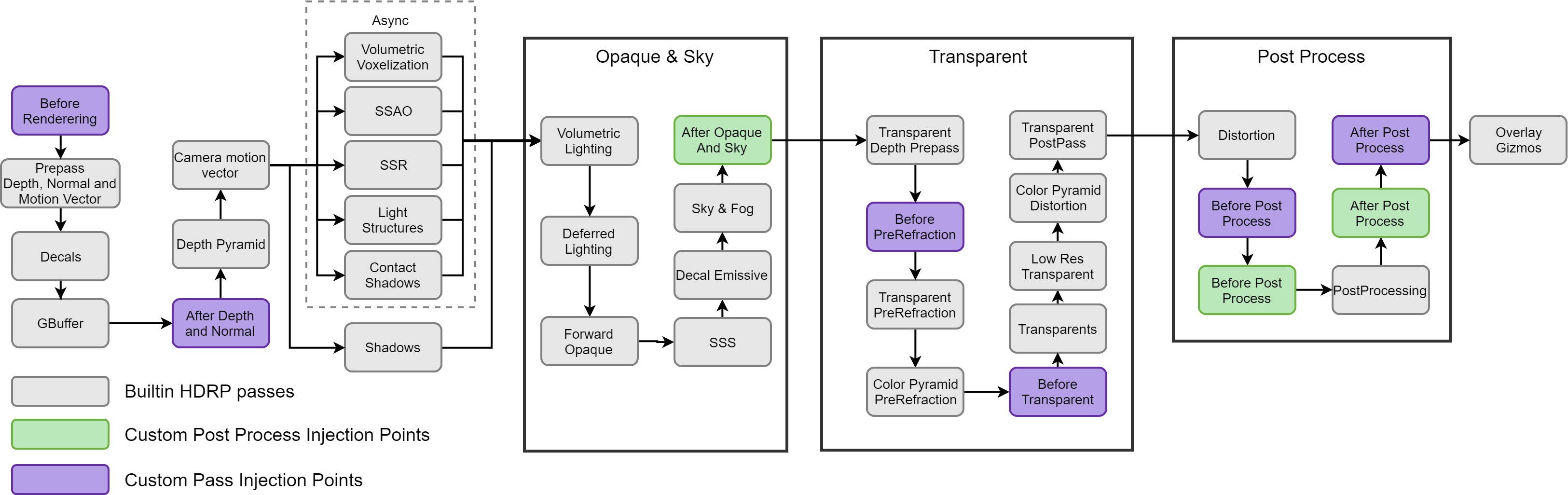 Custom passes can be injected at 6 different places. Note that these injection points don't tell you exactly where you pass will be executed, the only guarantee we give is that a certain list of buffers will be available for Read or Write and will contain a certain subset of objects rendered before your pass. Unlike Universal Render Pipeline, we don't give you the guarantee that your passes will be executed before or after any HDRP internal operation (also due to our async rendering). However we guarantee that the injection points will be triggered from top to bottom in this order in a frame: