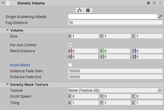 | Scroll Speed | Specifies the speed (per-axis) at which the Density Volume scrolls the texture. If you set every axis to 0, the Density Volume does not scroll the texture and the fog is static. |