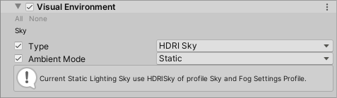 The Visual Environment uses the Volume framework, so to enable and modify Visual Environment properties, you must add a Visual Environment override to a Volume in your Scene.