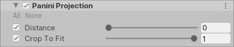 Panini Projection uses the Volume framework, so to enable and modify Panini Projection properties, you must add a Panini Projection override to a Volume in your Scene. To add Panini Projection to a Volume: